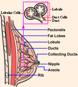 The Normal Breast Structure The main parts of the female breast are lobules (milk-producing glands), ducts (milk passages that connect the lobules and the nipple), and stroma (fatty tissue and ligaments surrounding the ducts and lobules, blood vessels, and lymphatic vessels). Most breast cancers begin in the ducts (ductal), some in the lobules (lobular) and the rest in other tissues. |